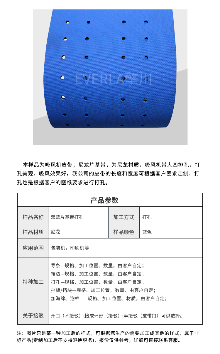 本样品为吸风机皮带,尼龙片基带,为尼龙材质,吸风机带大四排孔,打孔美观,吸风效果好。我公司的皮带的长度和宽度可根据客户要求定制,打孔也是根据客户的图纸要求进行打孔。