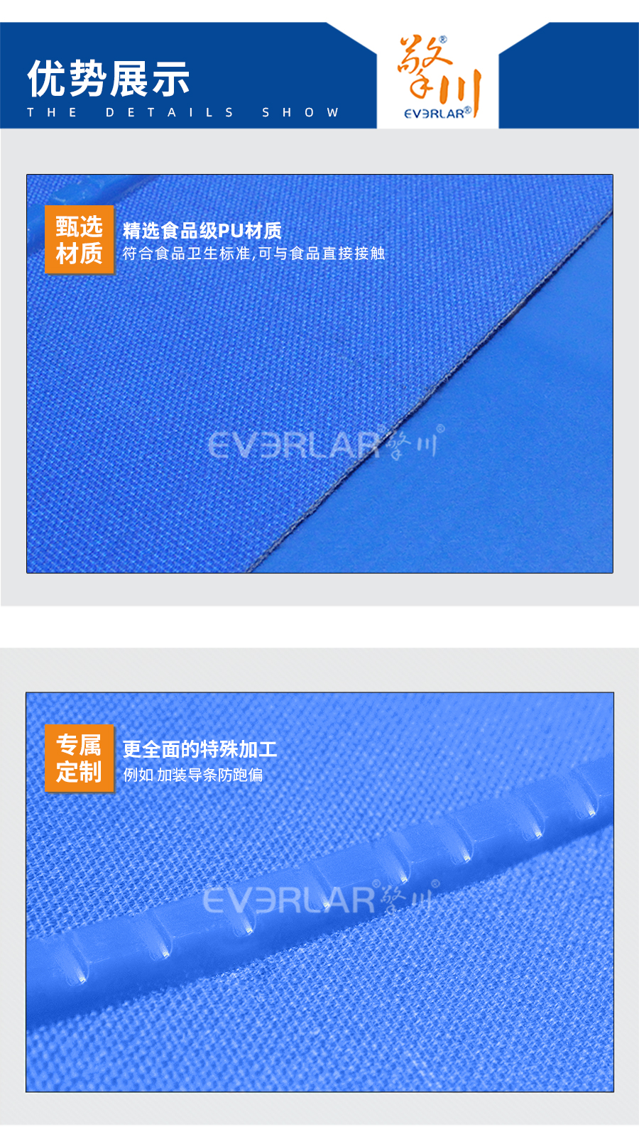 输送带也被称为聚氨酯输送带,它是经过处理的高强度人工合成聚氨酯作为承载骨架,涂覆层由聚氨酯树脂制成。不但具有普通输送带的抗拉强度高、曲饶性好、轻、薄、韧等特点,而且耐油,容易清洗。在食品行业使用比较多,因此用在食品行业时也叫