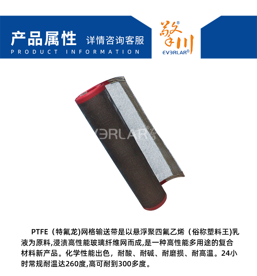 特氟龙网格输送带:耐高温,耐腐蚀,耐弯折,表面平滑,易清洗,不易脱落,耐酸,耐碱耐磨损,使用寿命长...
